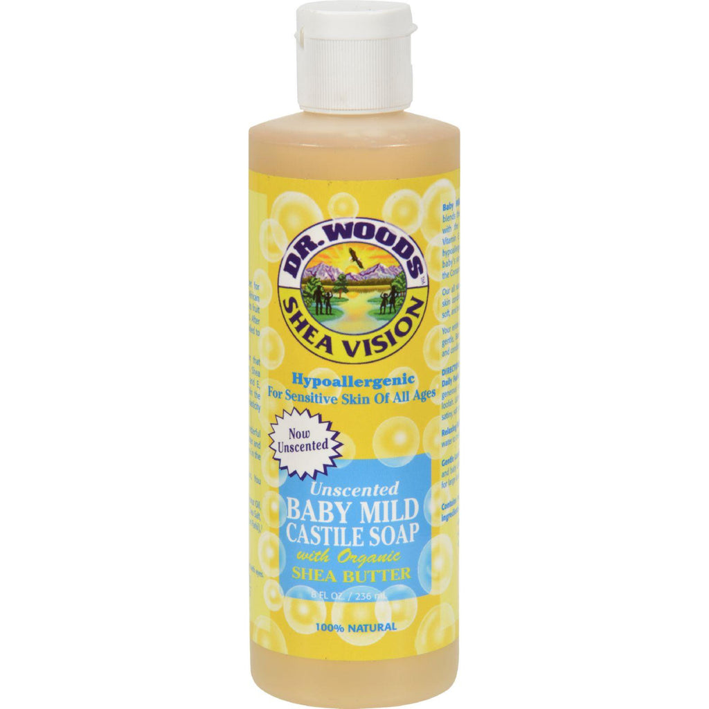 Dr. Woods Shea Vision Pure Castile Soap Baby Mild with Organic Shea Butter Description: Dr. Woods Castile Soap is very mild and versatile for everyday as a body wash, facial cleanser, shampoo, and shaving lather. It is also excellent as a mild laundry detergent. Disclaimer These statements have not been evaluated by the FDA. These products are not intended to diagnose, treat, cure, or prevent any disease.