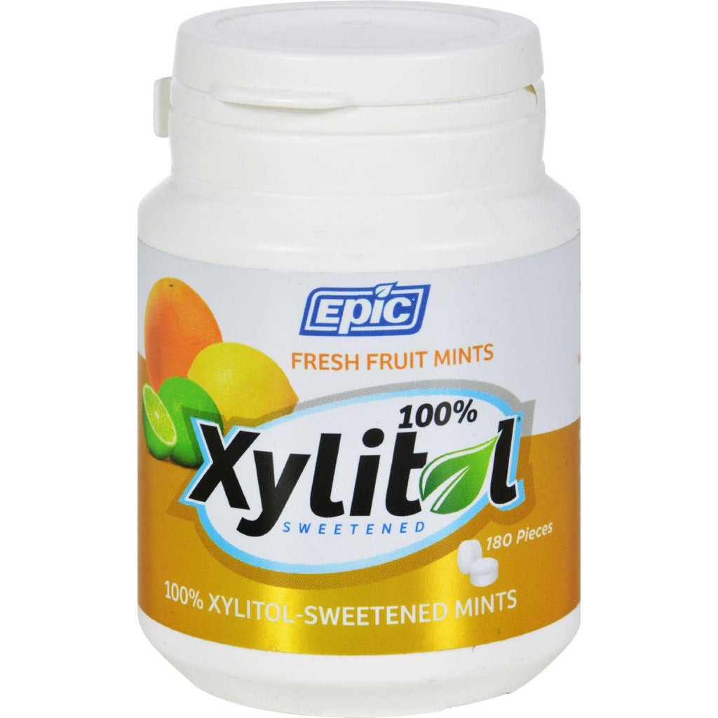 So irresistible, youell want to keep a bottle in your car, your desk drawer AND your briefcase. Sugar-free and sweetened exclusively with xylitol, Epic's Fresh Fruit Mints give a little kick to your daily 6 grams of xylitol that dentists worldwide recommend to help stop tooth decay. Weere perfect for those whoeve always picked the orange tic tacs e and youere assured, too, that those with lesser palettes than yours will shy away - too timid to step up to the fruity-healthy-minted plate. DETAILS Perfect Size for Cupholder or Desk Drawer 100% Xylitol-Sweetened Contains NO Aspartame Natural Citrus Flavors, Contains NO Mint