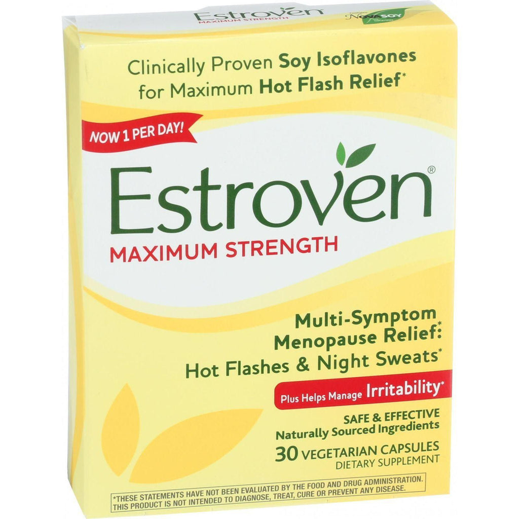 New and Improved Estroven Maximum Strength is a safe and effective dietary supplement made with a strong, triple-action formula that provides maximum relief from multiple menopause symptoms.* New and Improved formula combining twice as much Black Cohosh as other leading brands with clinically proven Soy Isoflavones gives you maximum relief for hot flashes and night sweats.* Plus, it helps to manage irritability and fatigue so you can feel like yourself again.* For best results, daily use for a minimum of 60 days is important. Estroven Maximum Strength contains a triple-action formula for maximum relief.* Specifically it features the following safe and naturally-sourced ingredients: Clinically proven Soy Isoflavones plus twice as much Black Cohosh as other leading brands to help reduce the frequency and severity of hot flashes and night sweats*