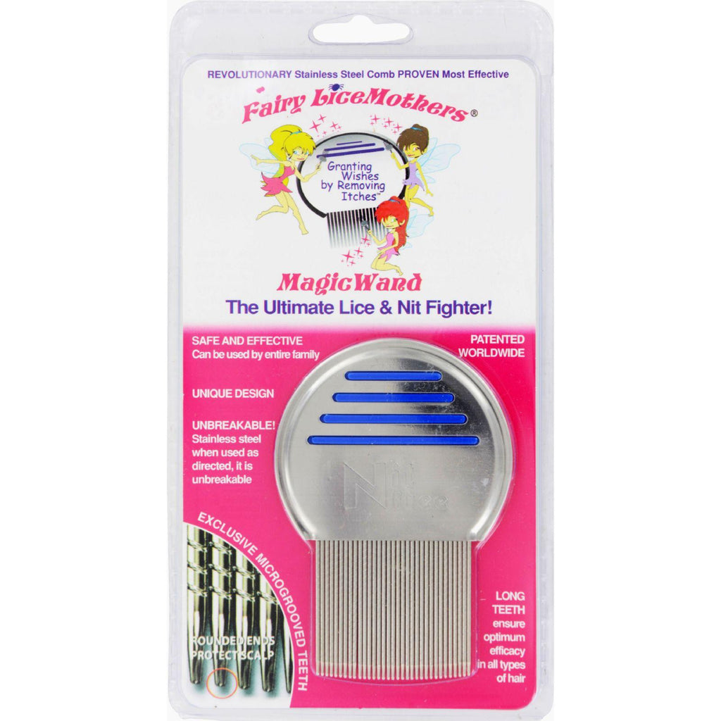 Fairy LiceMothers' MagicWand (Nit Free Terminator Comb) is made of tempered steel. It's the #1 Nit Removal comb on the market. Long metal teeth help drag nits out of the hair using micro-grooving and rounded ends to protect the scalp. The "micro-grooving" on the teeth consist of microscopic cutting edges that are positioned in a tight spiral form. With thorough combing, these cutting edges along with the dragging action of the teeth remove even the tiniest nit. Also uses anti-slip bands to allow for better gripping and control. To aid in the nit removal process, Fairy LiceMothers' MagicMousse is highly recommended.