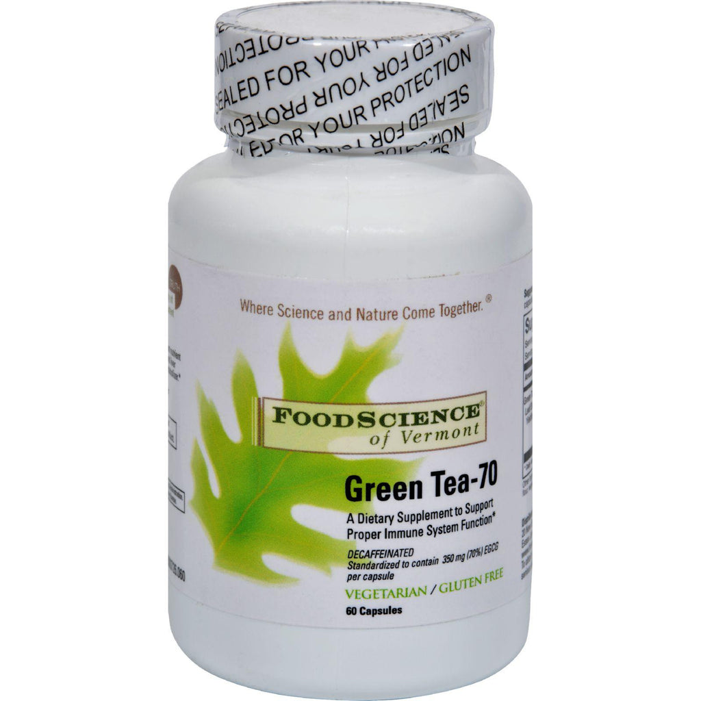 FoodScience of Vermont Green Tea-70 Description: Green Tea - 70 a dietary supplement to support proper immune system function. Green Tea - 70 contains a high yield of epigallo-catechin-3-gallate (EGCG) an important nutrient that supports cardiovascular, joint, intestinal and liver functions. It is a potent antioxidant and fat metabolizer.* Free Of Citrus, corn, egg, gluten, milk, sodium, soy, wheat, yeast, added sugars, synthetic dyes, artificial flavorings and preservatives. Disclaimer These statements have not been evaluated by the FDA. These products are not intended to diagnose, treat, cure, or prevent any disease.