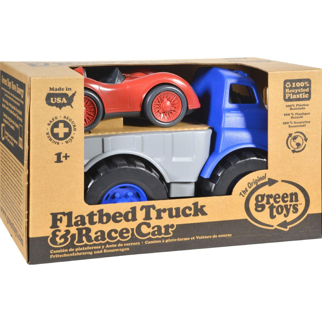 Gentlemen (and ladies) start your environmentally responsible engines! The Green Toys Flatbed Truck with Race Car is on the move. This sturdy blue truck hauls our sleek red hot rod on its back, and has a flatbed that tilts up to allow the car to roll off. Here's an even greater incentive to make your kids drink their milk. Green Toys uses recycled milk containers as the main ingredient to create their toys. The milk containers are re-processed into high-density polyethylene (HDPE). It's one of the safest, cleanest plastics around. Everything from the collection of materials to the production of Green Toys occurs in Los Angeles, CA. Local production of toys means that far fewer miles are used for transportation. On average, every pound of recycled milk jugs used in the making of Green Toys saves energy equal to 3,000 AAA batteries. Green Toys products are tested by nationally recognized, independent, third-party labs (located in the USA.) They contain no traceable amounts of Phthalates or BPA. They are also designed without any external coatings, eliminating the fear of lead paint. Although Green Toys may not be as nutritious as a glass of milk, you no longer need to worry about what odd chemicals your kids are ingesting every time they launch a playful bite into one of their toys. Dimensions: Truck: 11e L x 6-1/4e H. Race Car: 6e L x 3-1/2e W.